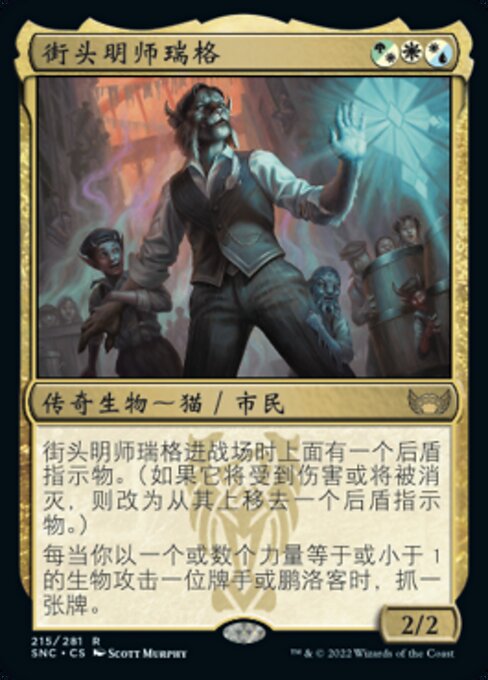 |  Variations : 2Parts— | Rigo, Streetwise Mentor2 / 2 Rigo enters with a shield counter on it. (If it would be dealt damage or destroyed, remove a shield counter from it instead.) Whenever you attack a player or planeswalker with one or more creatures with power 1 or less, draw a card.