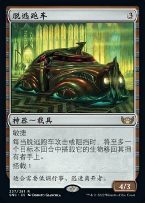|  Variations : 1Parts— | Getaway Car4 / 3 Haste Whenever this Vehicle attacks or blocks, return up to one target creature that crewed it this turn to its owner's hand. Crew 1
