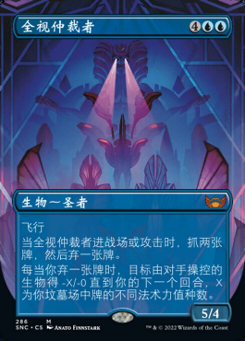 |  Variations : 1Parts— | All-Seeing Arbiter5 / 4 Flying Whenever this creature enters or attacks, draw two cards, then discard a card. Whenever you discard a card, target creature an opponent controls gets -X/-0 until your next turn, where X is the number of different mana values among cards in your graveyard.