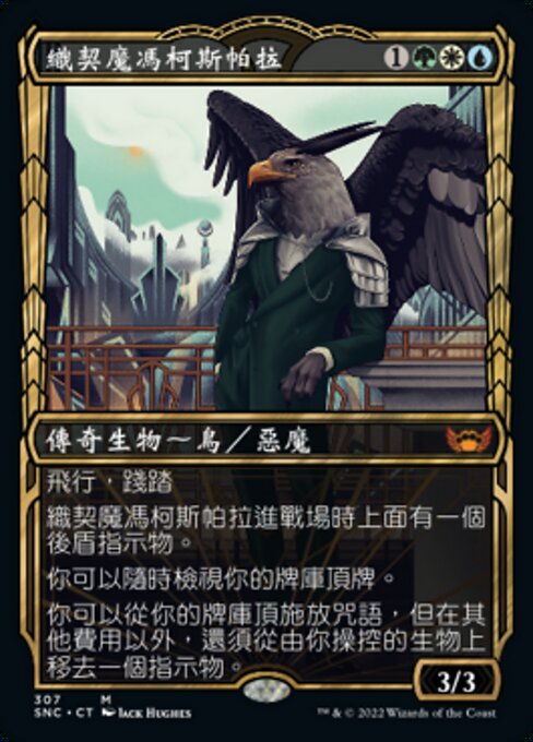 |  Variations : 2Parts— | Falco Spara, Pactweaver3 / 3 Flying, trample Falco Spara enters with a shield counter on it. You may look at the top card of your library any time. You may cast spells from the top of your library by removing a counter from a creature you control in addition to paying their other costs.