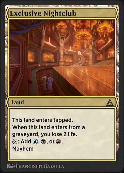 ![]() Variations : 1Parts— | Oscorp IndustriesThis land enters tapped. When this land enters from a graveyard, you lose 2 life. Mayhem (You may play this card from your graveyard if you discarded it this turn. Timing rules still apply.)