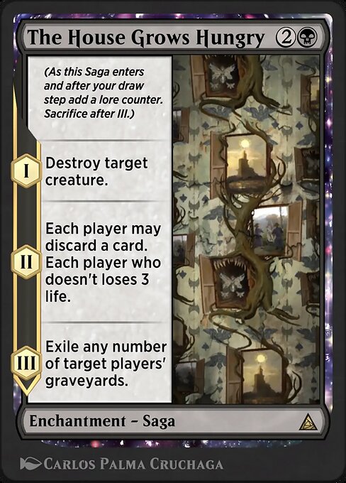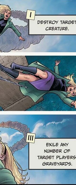 ![]() Variations : 1Parts— | The Death of Gwen Stacy(As this Saga enters and after your draw step, add a lore counter. Sacrifice after III.) I — Destroy target creature. II — Each player may discard a card. Each player who doesn't loses 3 life. III — Exile any number of target players' graveyards.
