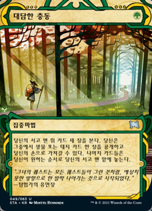 ![]() Variations— Parts— | Impulso AventureiroOlhe os três cards do topo de seu grimório. Você pode revelar um card de criatura ou terreno dentre eles e colocá-lo em sua mão. Coloque o restante no fundo de seu grimório em qualquer ordem.