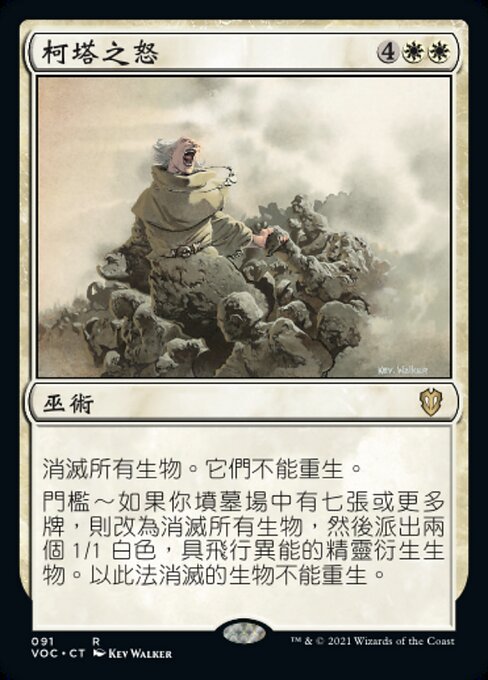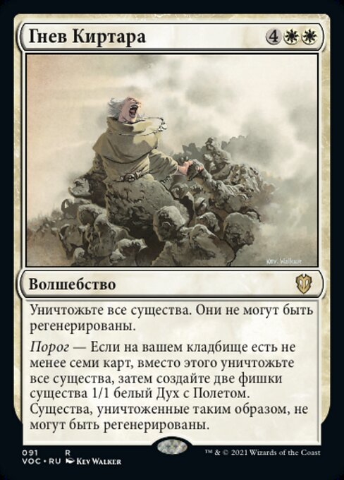 ![]() Variations— Parts— | Kirtars ZornZerstöre alle Kreaturen. Sie können nicht regeneriert werden. Grenzwert — Falls sieben oder mehr Karten in deinem Friedhof sind, zerstöre stattdessen alle Kreaturen und erzeuge dann zwei 1/1 weiße Geist-Kreaturenspielsteine mit Flugfähigkeit. Auf diese Weise zerstörte Kreaturen können nicht regeneriert werden.
