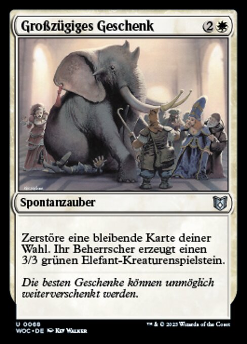 ![]() Variations— Parts— | Presente GenerosoDestrua a permanente alvo. Seu controlador cria uma ficha de criatura Elefante verde 3/3.