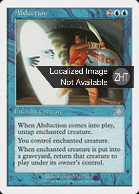![]() Variations— Parts— | AbductionEnchant creature When this Aura enters, untap enchanted creature. You control enchanted creature. When enchanted creature dies, return that card to the battlefield under its owner's control.
