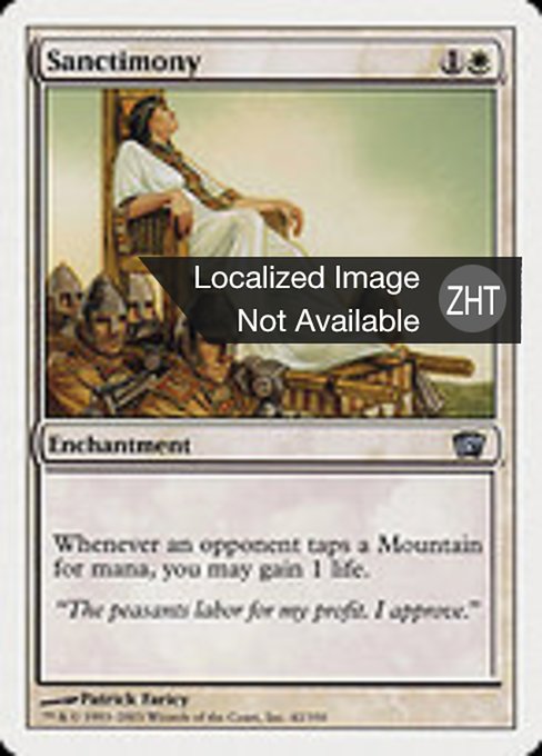 ![]() Variations— Parts— | SanctimonyWhenever an opponent taps a Mountain for mana, you may gain 1 life.