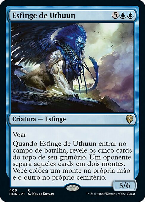 |  Variations— Parts— | Esfinge de Uthuun5 / 6 Vuela. Cuando la Esfinge de Uthuun entre al campo de batalla, muestra las cinco primeras cartas de tu biblioteca. Un oponente separa esas cartas en dos montones. Pon un montón en tu mano y el otro en tu cementerio.