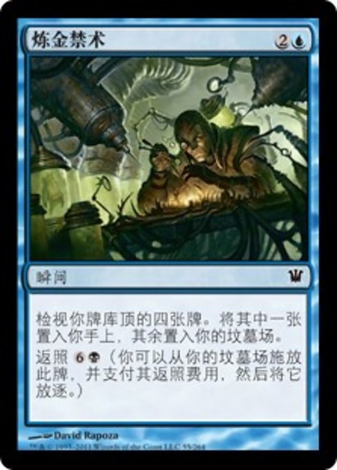 |  Variations— Parts— | 鍊金禁術檢視你牌庫頂的四張牌。 將其中一張置入你手上,其餘置入你的墳墓場。 返照