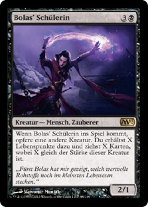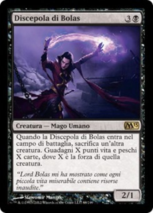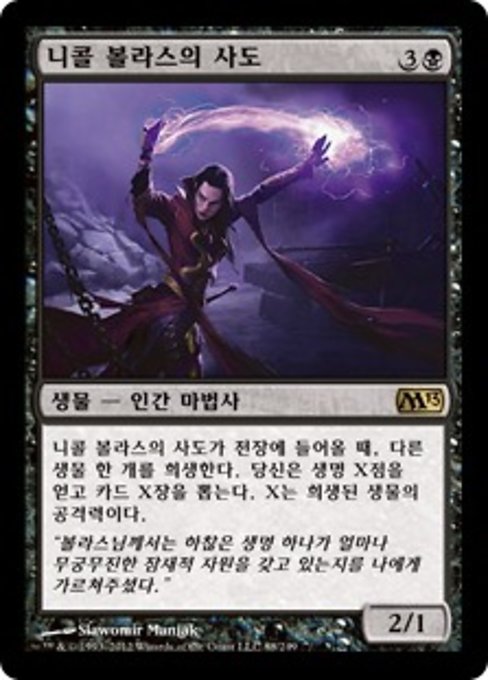 |  Variations— Parts— | Discípulo de Nicol Bolas2 / 1 Cuando el Discípulo de Nicol Bolas entre al campo de batalla, sacrifica otra criatura. Ganas X vidas y robas X cartas, donde X es la fuerza de esa criatura.