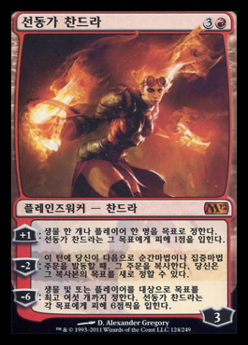 |  Variations— Parts— | 선동가 찬드라+1 +1+1 생물 한 개나 플레이어 한 명을 목표로 정한다. 선동가 찬드라는 그 목표에게 피해 1점을 입힌다.-2 +1: 생물 한 개나 플레이어 한 명을 목표로 정한다. 선동가 찬드라는 그 목표에게 피해 1점을 입힌다. -2+1 생물 한 개나 플레이어 한 명을 목표로 정한다. 선동가 찬드라는 그 목표에게 피해 1점을 입힌다.-2 이 턴에 다음으로 당신이 순간마법이나 집중마법 주문을 발동할 때, 그 주문을 복사한다. 당신은 그 복사본의 목표를 새로 정할 수 있다.-6 : 생물 및 플레이어를 대상으로 최대 여섯 개까지의 목표를 정한다. 선동가 찬드라는 각 목표에게 피해 6점을 입힌다.