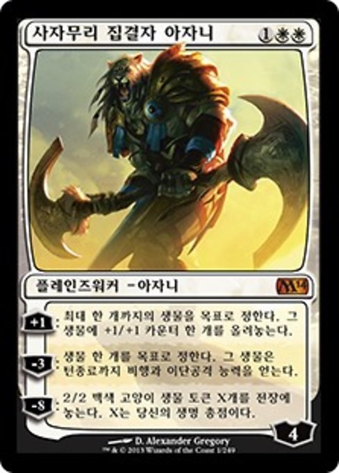 |  Variations— Parts— | Ajani, Evocatore del Branco+1 : Scegli fino a una creatura bersaglio. Metti un segnalino +1/+1 su di essa.-3 +1 su di essa.-3+1 su di essa.-3 Una creatura bersaglio ha volare e doppio attacco fino alla fine del turno.-8 : Metti sul campo di battaglia X pedine creatura Felino 2/2 bianche, dove X sono i tuoi punti vita.