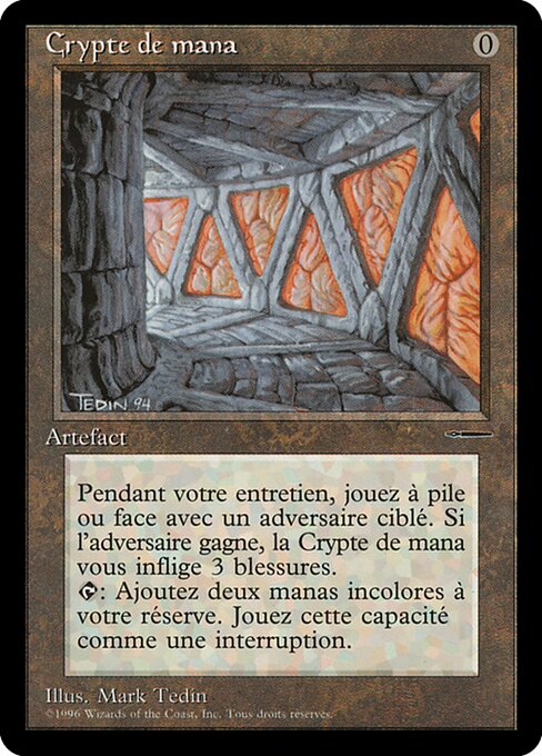 ![]() Variations— Parts— | Mana CryptAt the beginning of your upkeep, flip a coin. If you lose the flip, this artifact deals 3 damage to you.