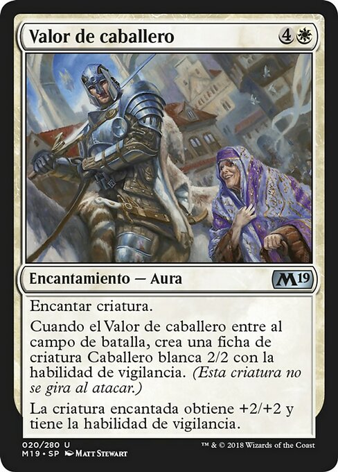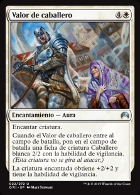 ![]() Variations— Parts— | Valor de caballeroEncantar criatura. Cuando el Valor de caballero entre al campo de batalla, pon en el campo de batalla una ficha de criatura Caballero blanca 2/2 con la habilidad de vigilancia. La criatura encantada obtiene +2/+2 y tiene la habilidad de vigilancia.