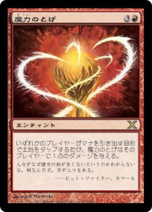 ![]() Variations— Parts— | Espinas de manáSiempre que un jugador gire una tierra para obtener maná, las Espinas de maná le hacen 1 punto de daño a ese jugador.