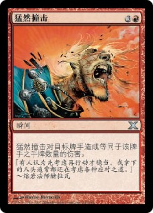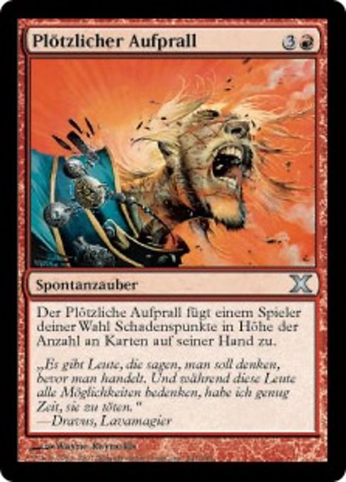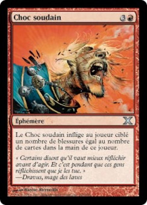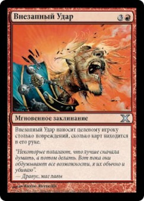 ![]() Variations— Parts— | 突然の衝撃プレイヤー1人を対象とする。突然の衝撃はそのプレイヤーに、そのプレイヤーの手札のカードの枚数に等しい点数のダメージを与える。