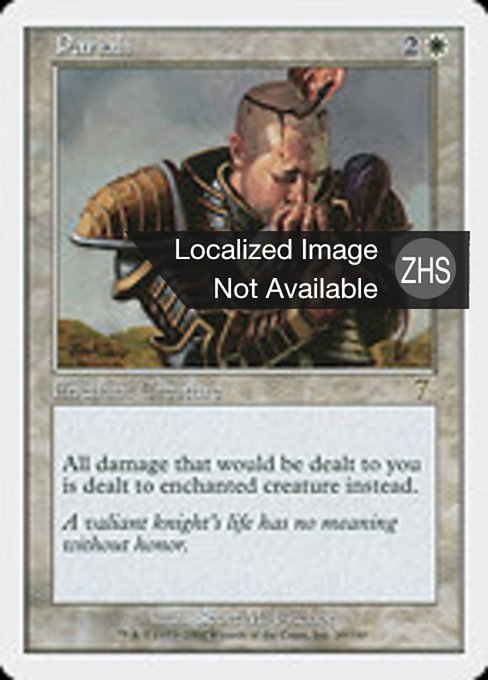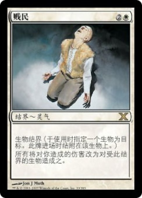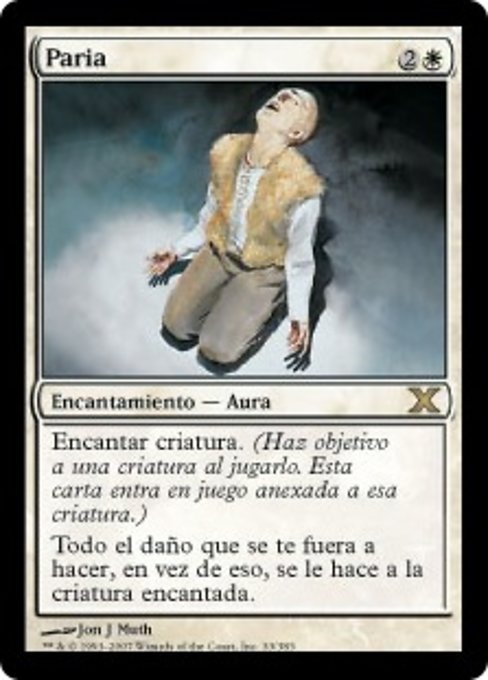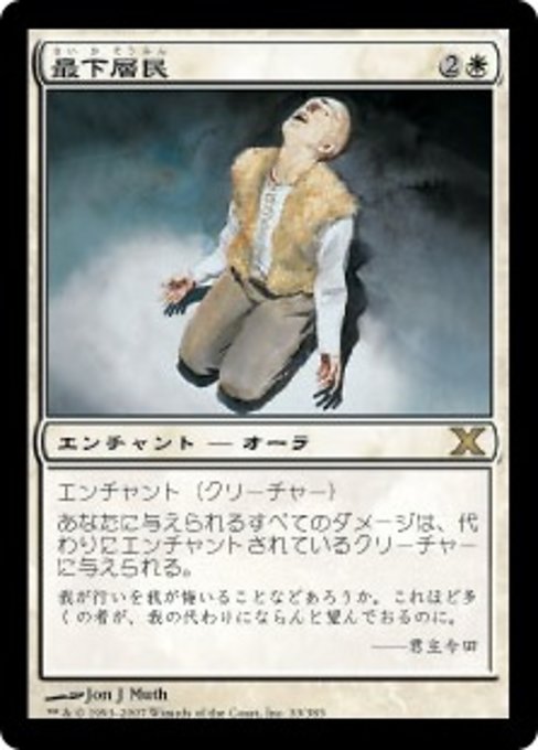 ![]() Variations— Parts— | 贱民生物结界(于使用时指定一个生物为目标。 此牌进场时结附在该生物上。) 所有将对你造成的伤害改为对受此结界的生物造成之。