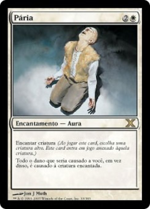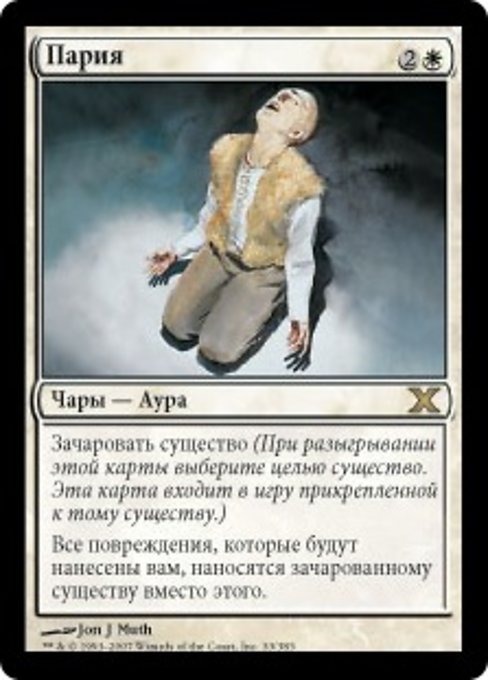 LegalitiesLegal Duel Brawl Penny Predh Legacy Modern Vintage Historic Timeless Commander Gladiator Premodern Oathbreaker Not Legal Future Pauper Alchemy Pioneer Standard Oldschool Standardbrawl Paupercommander RulingsIf you control multiple Pariahs enchanting different creatures, you choose which redirection effect to apply. You can't divide damage dealt by one source or combat damage dealt by multiple creatures simultaneously. For example, if a spell would deal 6 damage to you and you control multiple Pariahs, you may have that 6 damage dealt to either of the enchanted creatures instead, but you can't choose to have 3 damage dealt to each one.