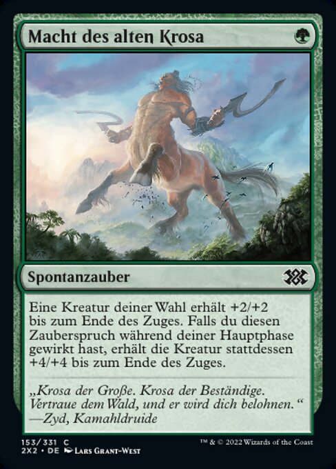 |  Variations— Parts— | Might of Old KrosaTarget creature gets +2/+2 until end of turn. If you cast this spell during your main phase, that creature gets +4/+4 until end of turn instead.