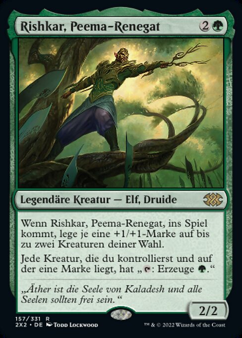 |  Variations : 1Parts— | Rishkar, Peema Renegade2 / 2 When Rishkar enters, put a +1/+1 counter on each of up to two target creatures. Each creature you control with a counter on it has "