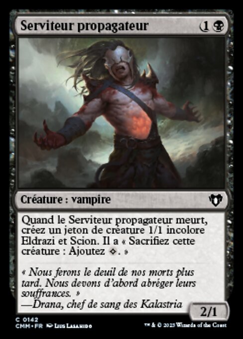 |  Variations— Parts— | Serviteur propagateur2 / 1 Quand le Serviteur propagateur meurt, créez un jeton de créature 1/1 incolore Eldrazi et Scion. Il a « Sacrifiez cette créature : Ajoutez