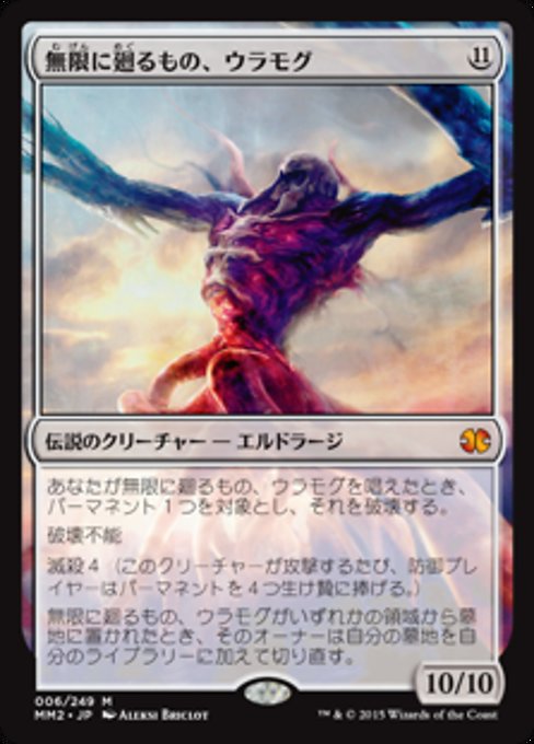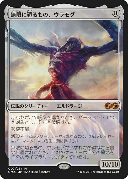 ![]() Variations : 1Parts— | 無限に廻るもの、ウラモグ10 / 10 あなたがこの呪文を唱えたとき、パーマネント1つを対象とする。それを破壊する。 破壊不能 滅殺4(このクリーチャーが攻撃するたび、防御プレイヤーはパーマネント4つを生け贄に捧げる。) 無限に廻るもの、ウラモグがいずこかから墓地に置かれたとき、オーナーは自分の墓地を自分のライブラリーに加えて切り直す。