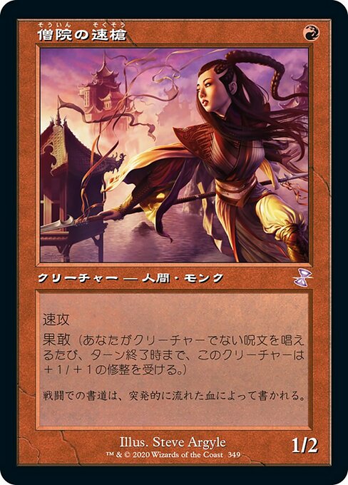![]() Variations : 1Parts— | 僧院の速槍1 / 2 速攻 果敢(あなたがクリーチャーでない呪文を唱えるたび、ターン終了時まで、このクリーチャーは+1/+1の修整を受ける。)