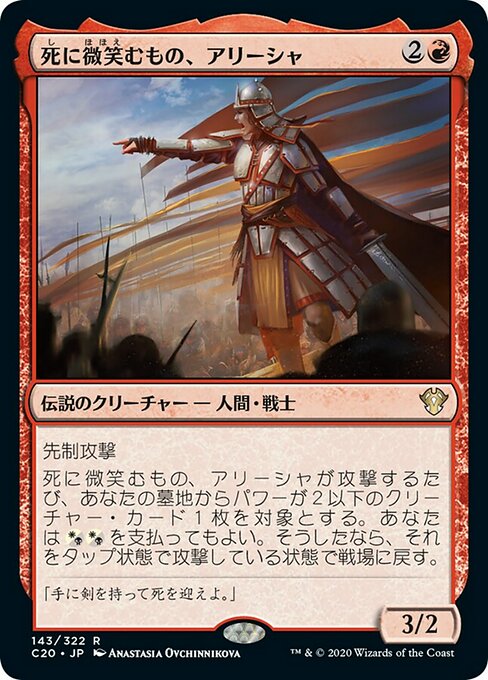 |  Variations : 1Parts— | 死に微笑むもの、アリーシャ3 / 2 先制攻撃 死に微笑むもの、アリーシャが攻撃するたび、あなたの墓地にありパワーが2以下であるクリーチャー・カード1枚を対象とする。あなたは