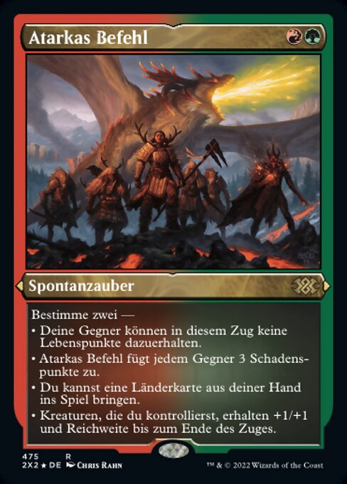 ![]() Variations : 1Parts— | アタルカの命令以下から2つを選ぶ。 ・このターン、あなたの対戦相手はライフを得られない。 ・アタルカの命令は各対戦相手にそれぞれ3点のダメージを与える。 ・あなたは、あなたの手札にある土地・カード1枚を戦場に出してもよい。 ・ターン終了時まで、あなたがコントロールしているすべてのクリーチャーは+1/+1の修整を受け到達を得る。