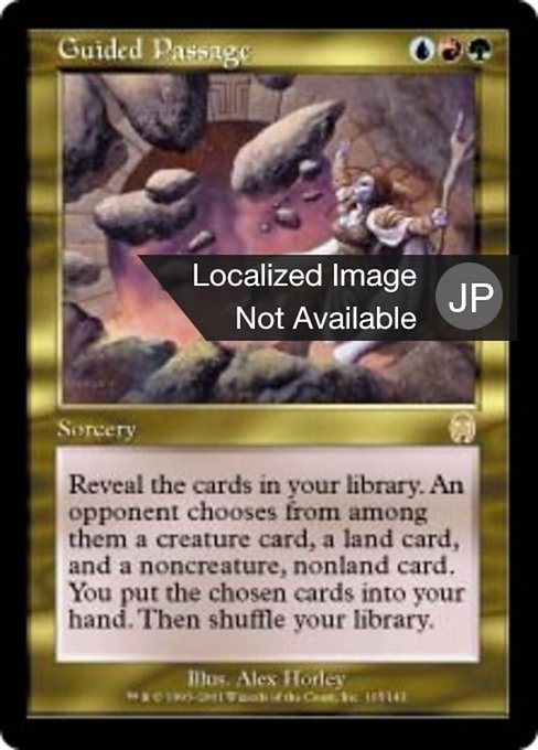 ![]() Variations : 1Parts— | 誘導路あなたのライブラリーにあるすべてのカードを公開する。対戦相手1人は、その中からクリーチャー・カード1枚と土地・カード1枚とクリーチャーでも土地でもないカード1枚を選ぶ。あなたはそれらの選ばれたカードをあなたの手札に加える。その後、ライブラリーを切り直す。