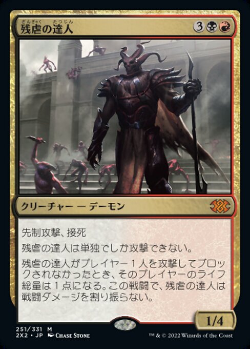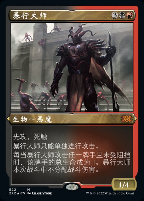 |  Variations : 1Parts— | 暴行大师1 / 4 先攻,死触 暴行大师只能单独进行攻击。 每当暴行大师攻击任一牌手且未受阻挡时,该牌手的总生命成为1。暴行大师本次战斗中不分配战斗伤害。