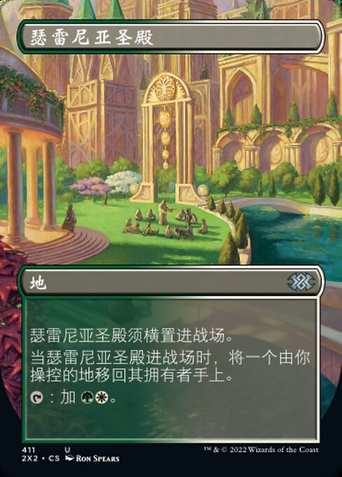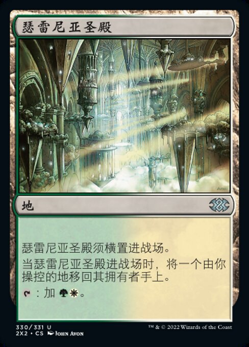 |  Variations : 1Parts— | 瑟雷尼亚圣殿瑟雷尼亚圣殿须横置进战场。 当瑟雷尼亚圣殿进战场时,将一个由你操控的地移回其拥有者手上。