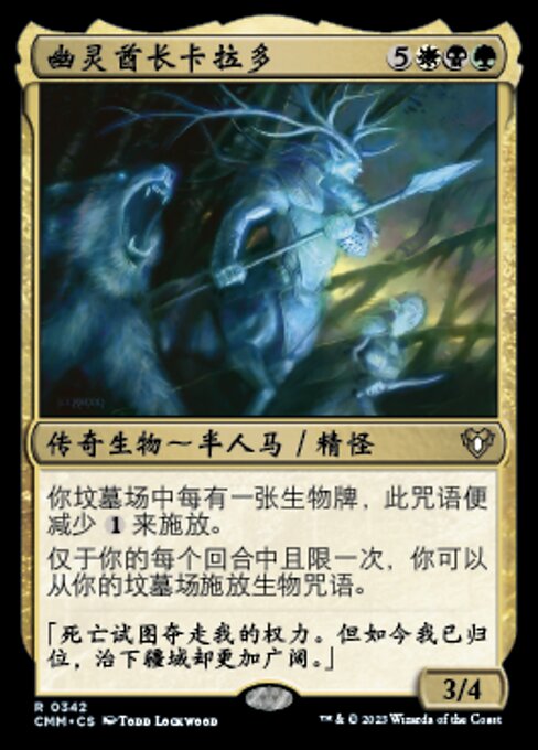 ![]() Variations : 1Parts— | 幽灵酋长卡拉多3 / 4 你坟墓场中每有一张生物牌,此咒语便减少 仅于你的每个回合中且限一次,你可以从你的坟墓场施放一个生物咒语。