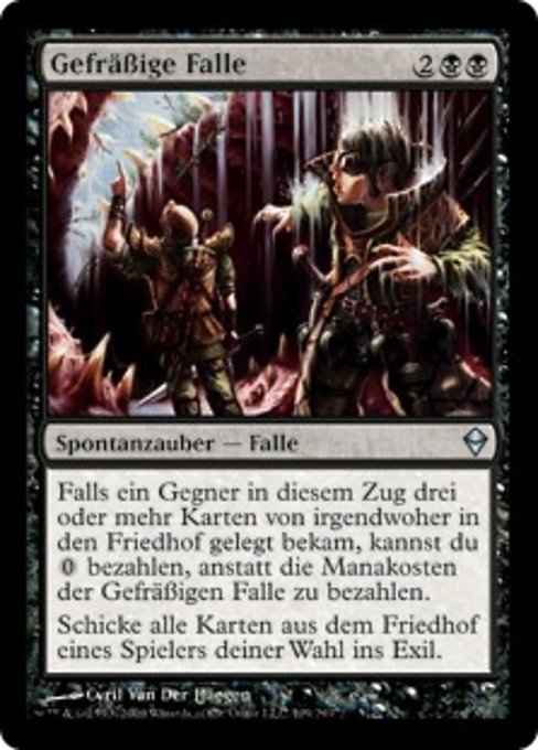 ![]() Variations— Parts— | Gefräßige FalleFalls ein Gegner in diesem Zug drei oder mehr Karten von irgendwoher auf seinen Friedhof gelegt bekam, kannst du Schicke alle Karten aus dem Friedhof eines Spielers deiner Wahl ins Exil.