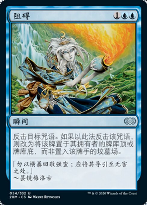 |  Variations— Parts— | ObstacleContrecarrez le sort ciblé. Si ce sort est contrecarré de cette manière, mettez cette carte au-dessus ou au-dessous de la bibliothèque de son propriétaire à la place du cimetière de ce joueur.