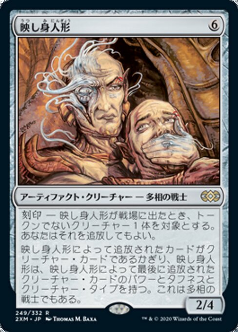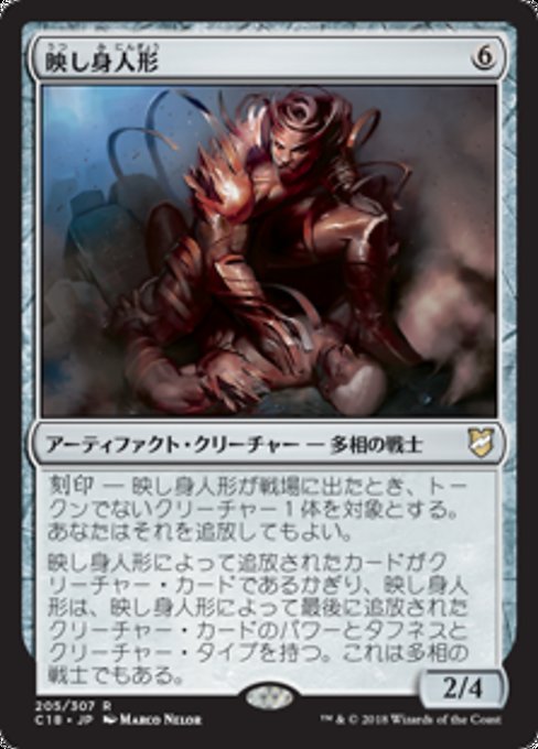 ![]() Variations— Parts—  | 映し身人形2 / 4 刻印 ― 映し身人形が戦場に出たとき、トークンでないクリーチャー1体を対象とする。あなたはそれを追放してもよい。 映し身人形によって追放されたカードがクリーチャー・カードであるかぎり、映し身人形は、映し身人形によって最後に追放されたクリーチャー・カードのパワーとタフネスとクリーチャー・タイプを持つ。これは多相の戦士でもある。