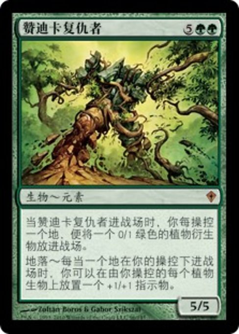 ![]() Variations— Parts— | 赞迪卡复仇者5 / 5 当赞迪卡复仇者进战场时,你每操控一个地,便派出一个0/1绿色植物衍生生物。 地落~每当一个地在你的操控下进战场时,你可以在每个由你操控的植物生物上各放置一个+1/+1指示物。