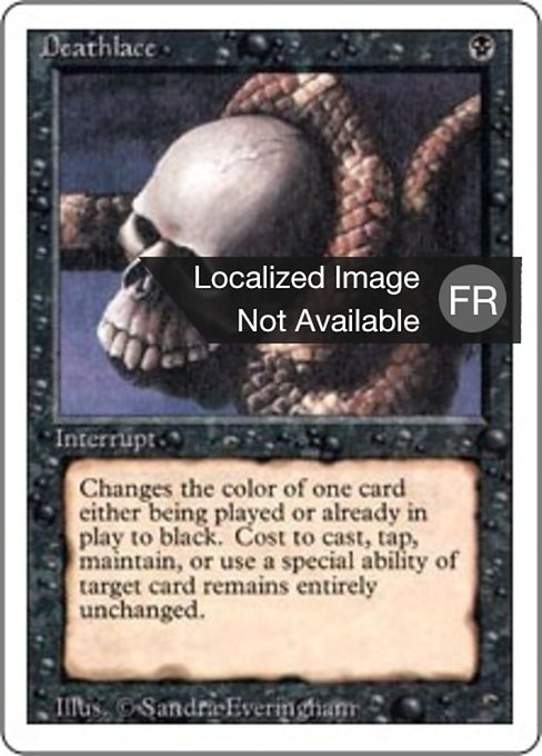 |  Variations— Parts— | DeathlaceTarget spell or permanent becomes black. (Mana symbols on that permanent remain unchanged.)