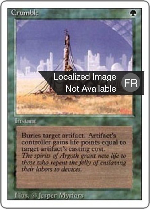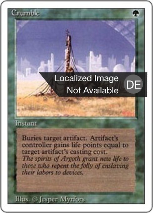 |  Variations— Parts— | CrumbleDestroy target artifact. It can't be regenerated. That artifact's controller gains life equal to its mana value.