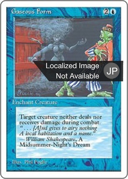 |  Variations— Parts— | Forma gaseosaEnchant creature Prevent all combat damage that would be dealt to and dealt by enchanted creature.