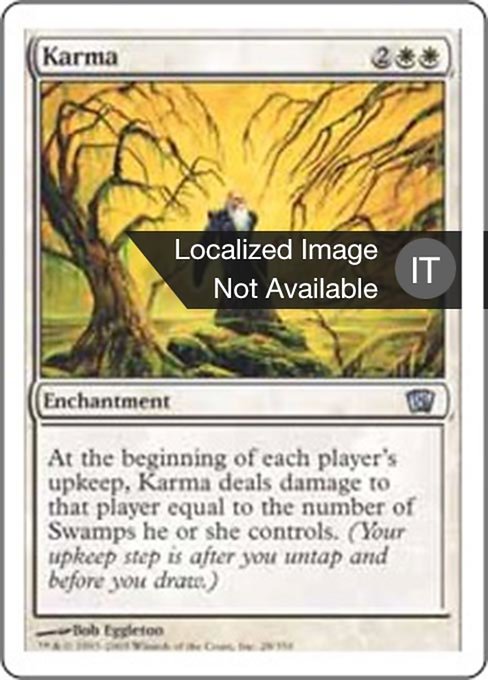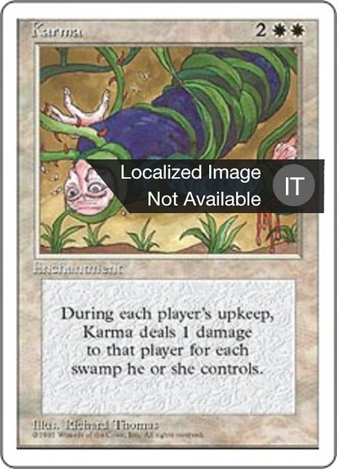 |  Variations— Parts— | KarmaAt the beginning of each player's upkeep, this enchantment deals damage to that player equal to the number of Swamps they control.