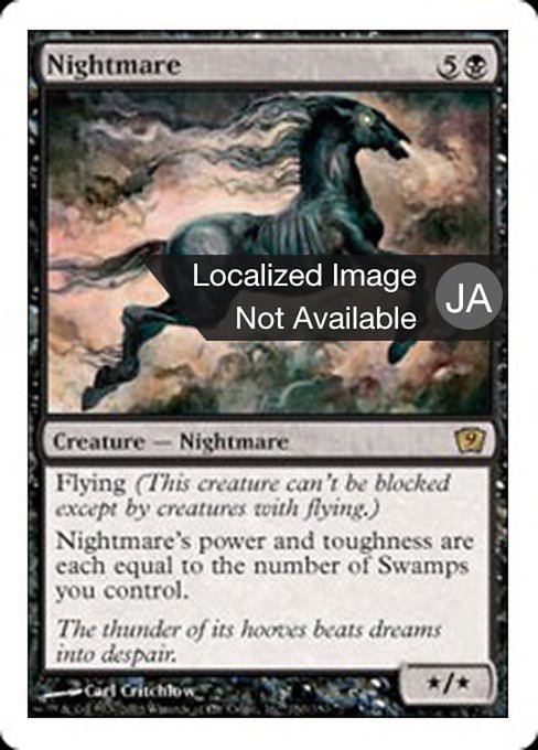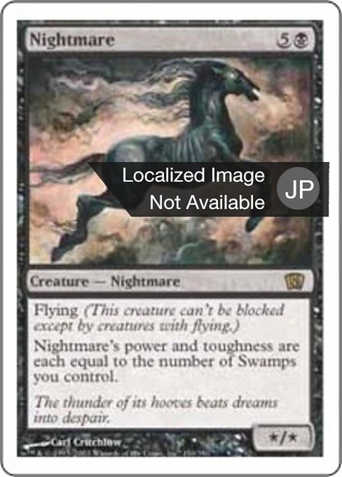 |  Variations— Parts— | 夢魔* / * Flying (This creature can't be blocked except by creatures with flying or reach.) Nightmare's power and toughness are each equal to the number of Swamps you control.