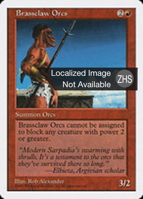 ![]() Variations— Parts— | Brassclaw Orcs3 / 2 This creature can't block creatures with power 2 or greater.