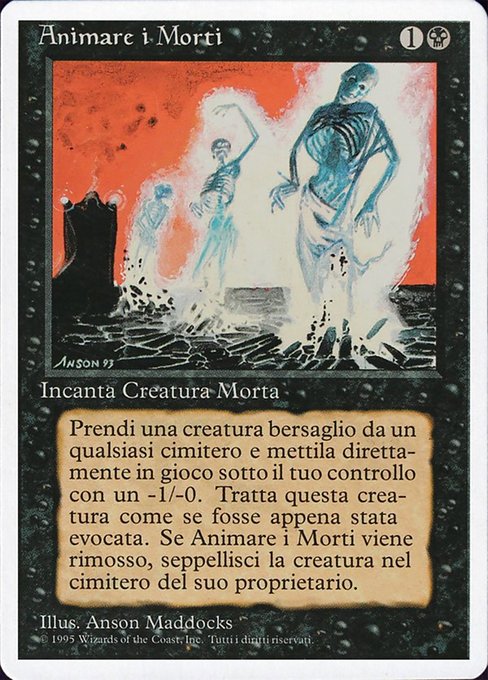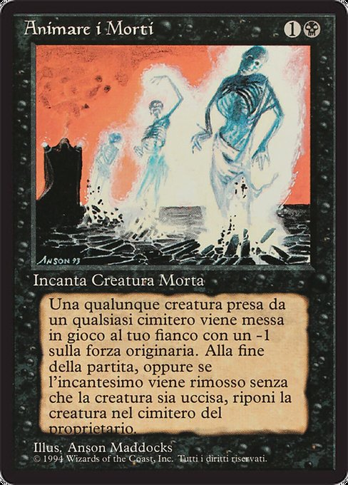 |  Variations— Parts— | Animare i MortiEnchant creature card in a graveyard When this Aura enters, if it's on the battlefield, it loses "enchant creature card in a graveyard" and gains "enchant creature put onto the battlefield with this Aura." Return enchanted creature card to the battlefield under your control and attach this Aura to it. When this Aura leaves the battlefield, that creature's controller sacrifices it. Enchanted creature gets -1/-0.