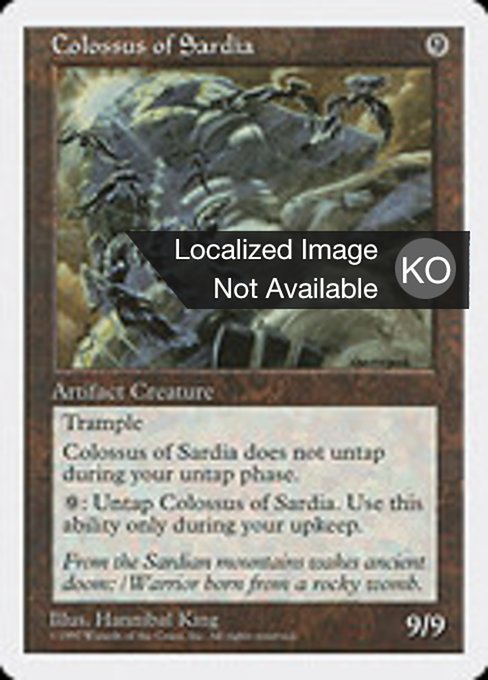 |  Variations— Parts— | Colosso di Sardia9 / 9 Trample (This creature can deal excess combat damage to the player or planeswalker it's attacking.) This creature doesn't untap during your untap step.