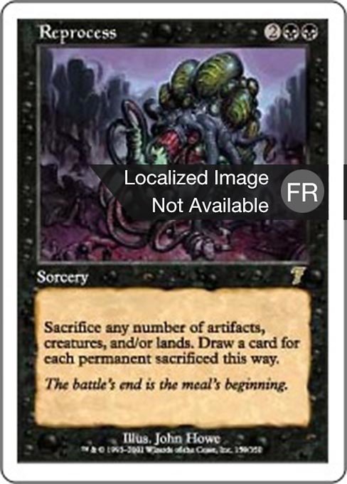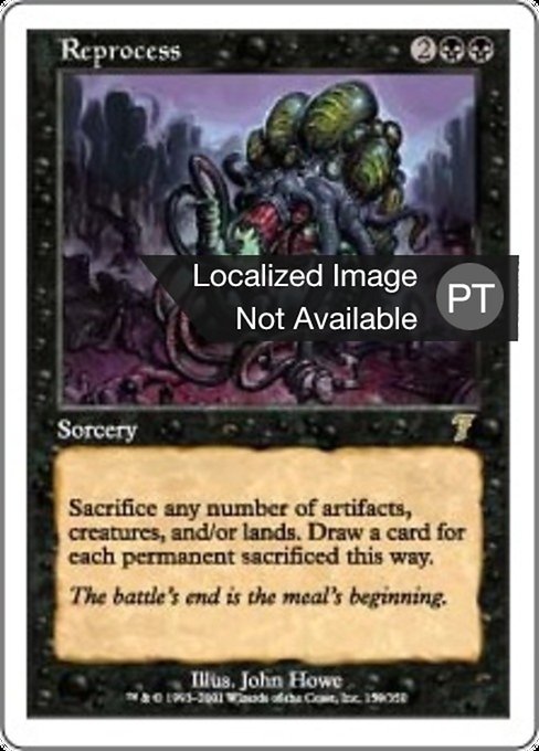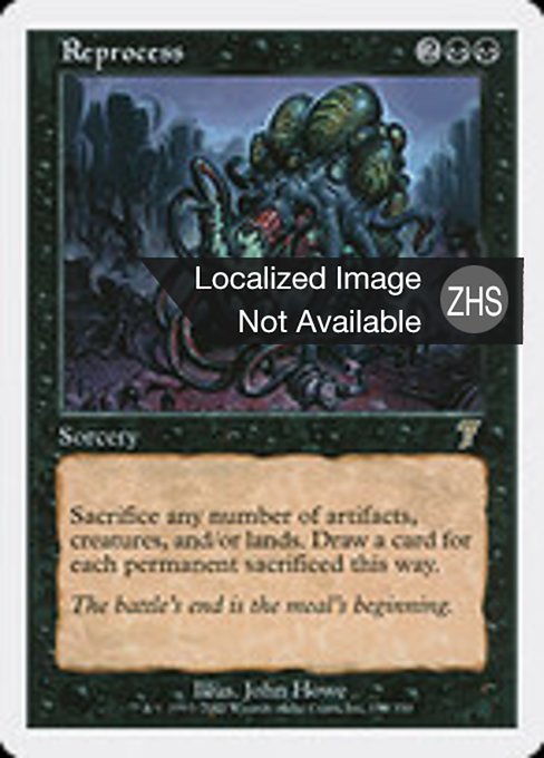 |  Variations : 1Parts— | ReprocessSacrifice any number of artifacts, creatures, and/or lands. Draw a card for each permanent sacrificed this way.