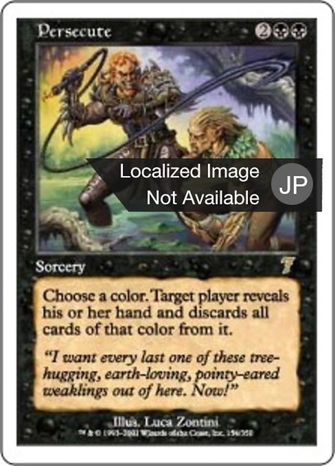 |  Variations— Parts— | PersecuteChoose a color. Target player reveals their hand and discards all cards of that color.