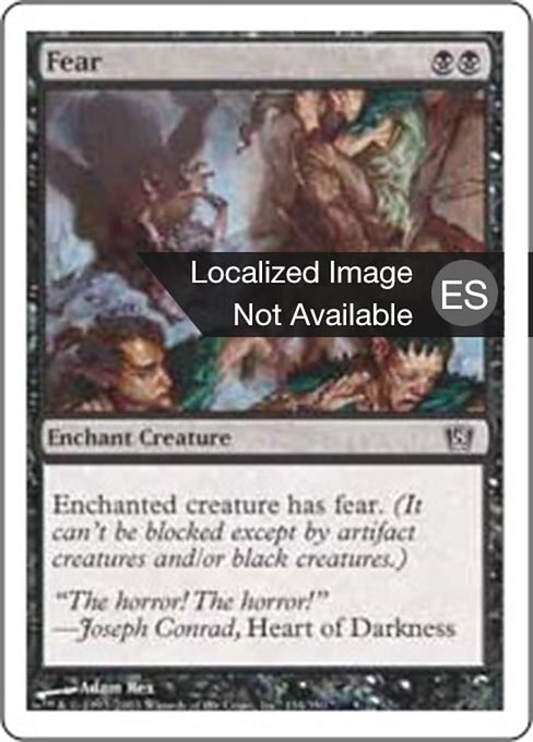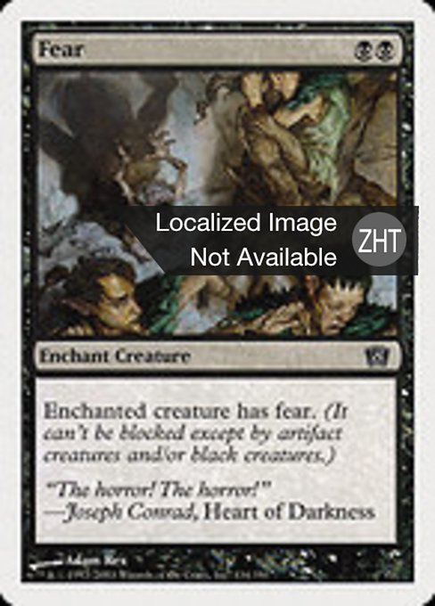 |  Variations : 1Parts— | FearEnchant creature (Target a creature as you cast this. This card enters attached to that creature.) Enchanted creature has fear. (It can't be blocked except by artifact creatures and/or black creatures.)