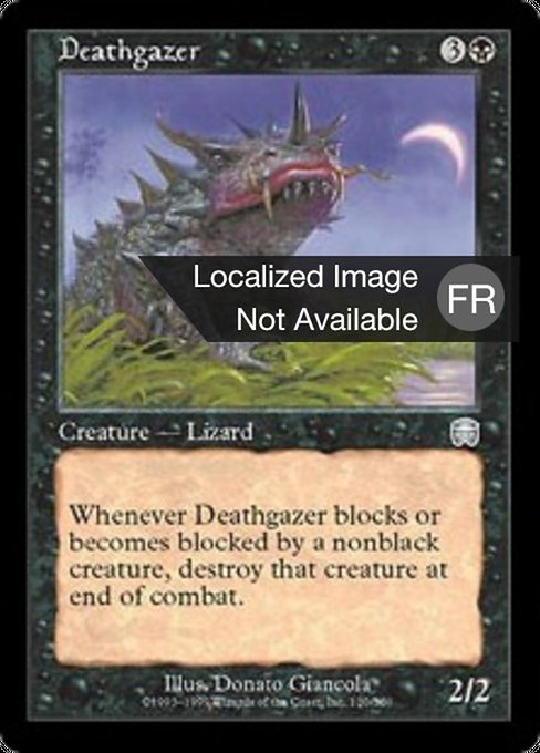 |  Variations— Parts— | Œil-de-mort2 / 2 À chaque fois que l'Œil-de-mort bloque ou devient bloqué par une créature non-noire, détruisez cette créature à la fin du combat.