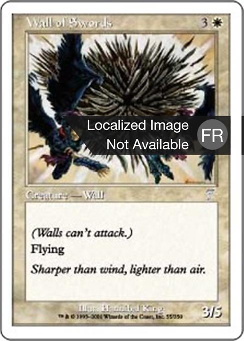 |  Variations— Parts— | Mur d'épées3 / 5 (Les murs ne peuvent pas attaquer.)Vol (Cette créature peut bloquer les créatures avec le vol.)